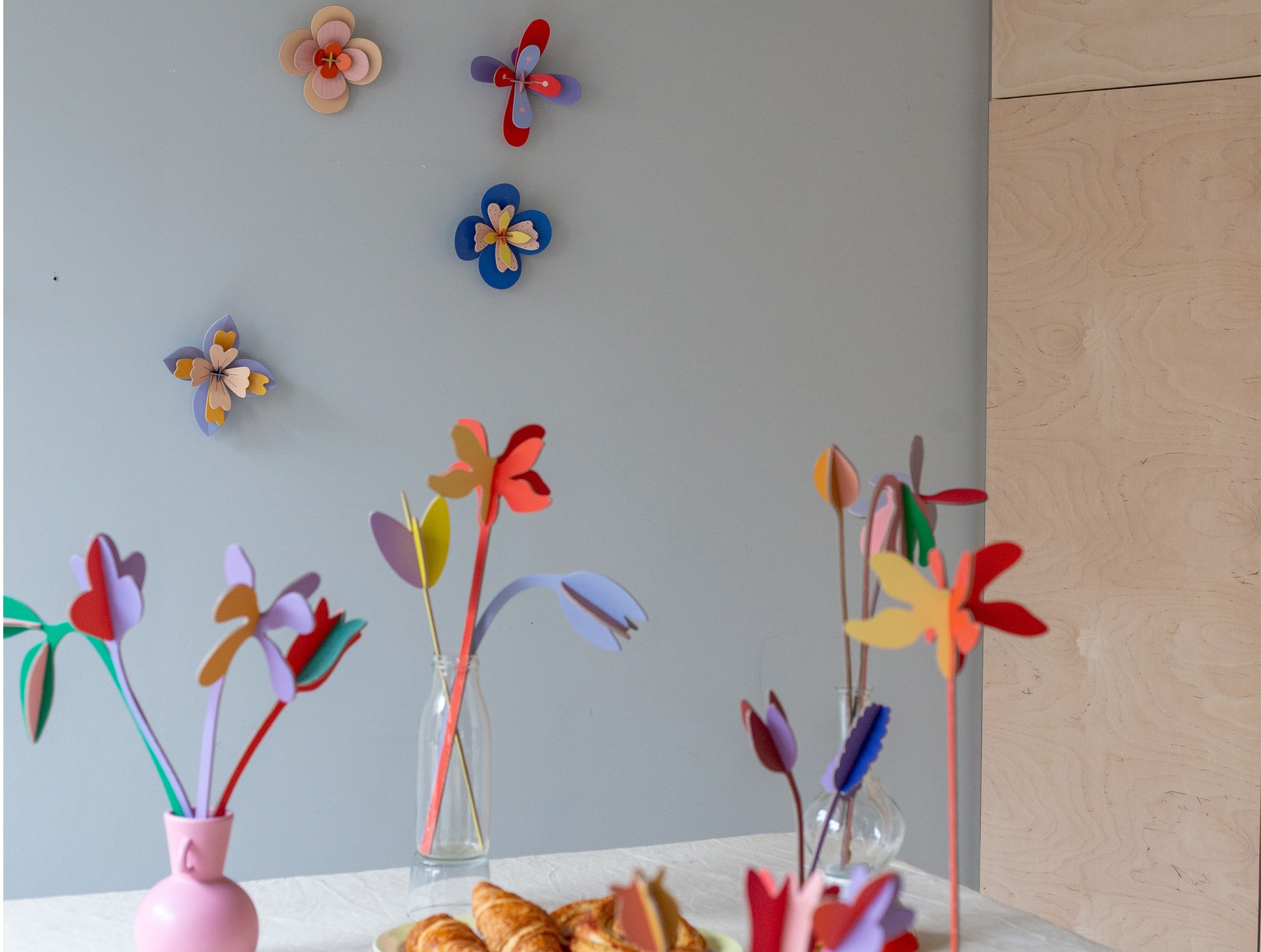 A second collaboration between Studio Roof and Jantien Baas has resulted in a collection with wall flowers. You can actually hang these flowers on the wall like a painting. Colourful objects that are sure to brighten up the room. This is a set of 3 flowers.