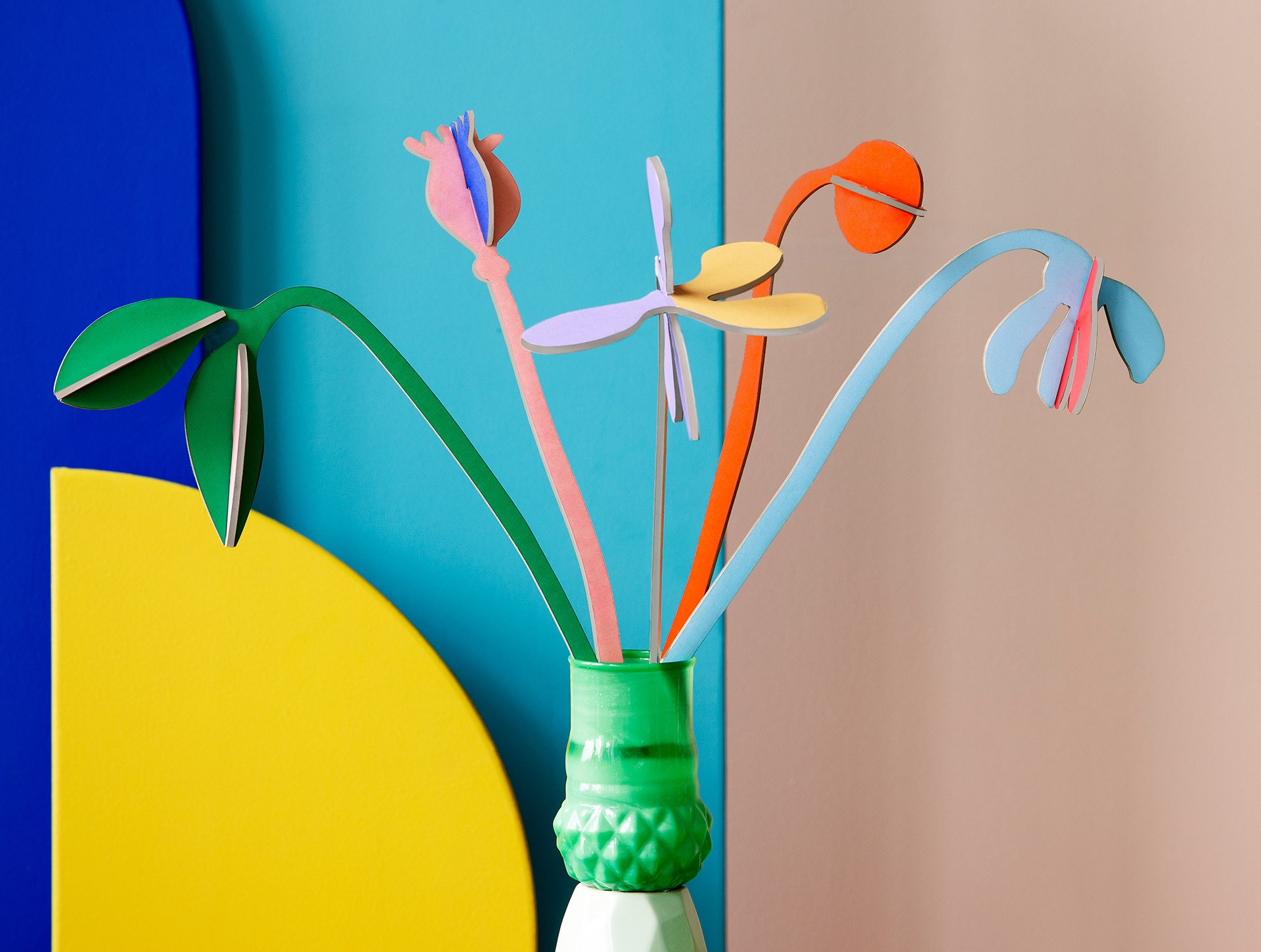 A collaboration between Studio Roof and Jantien Baas has led to a collection with flowers. This is a bouquet of 5 flowers. Nice to put in a vase and to brighten up your room or for example to hang on your wall with masking tape. All the flowers have two colours, the front and the back, so you can choose which colour you want to be visible.