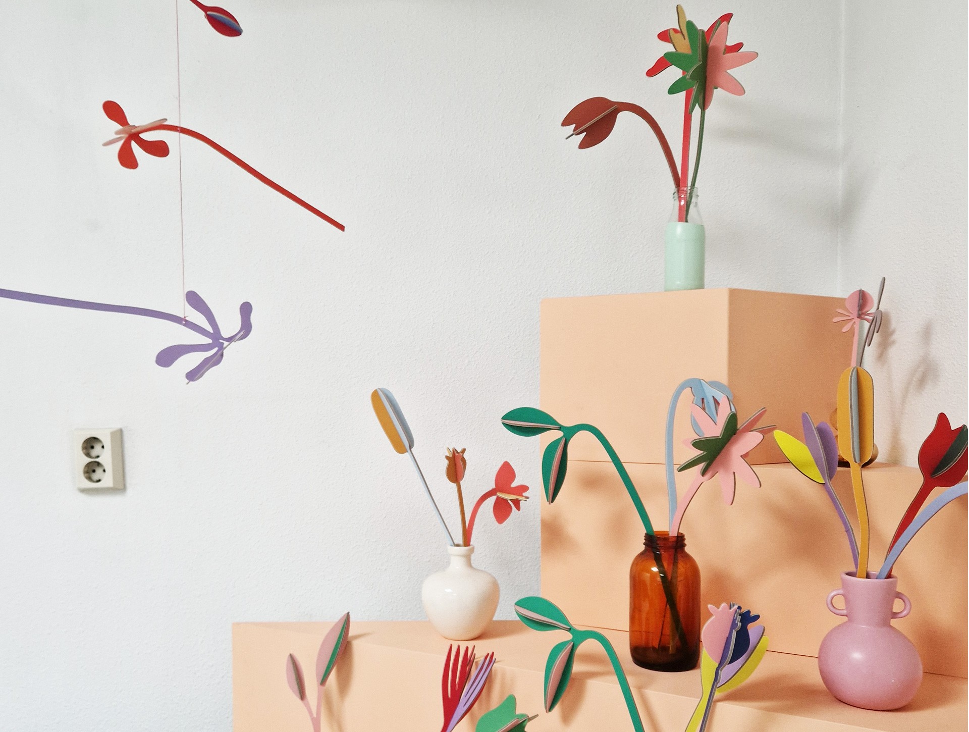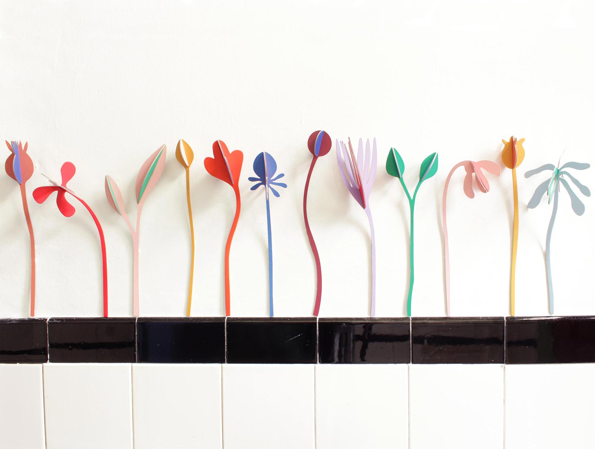 A collaboration between Studio Roof and Jantien Baas has led to a new collection of flowers. This is a bouquet of 3 flowers. Nice to put in a vase and brighten up your room or for example hang on your wall with a masking tape. All flowers have two colors, the front and the back, so you can choose which color you want to have visible.