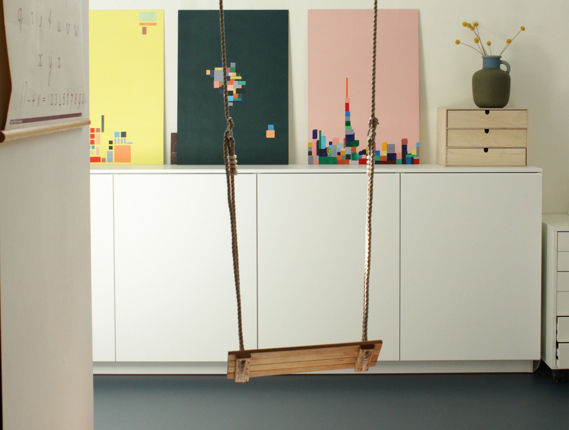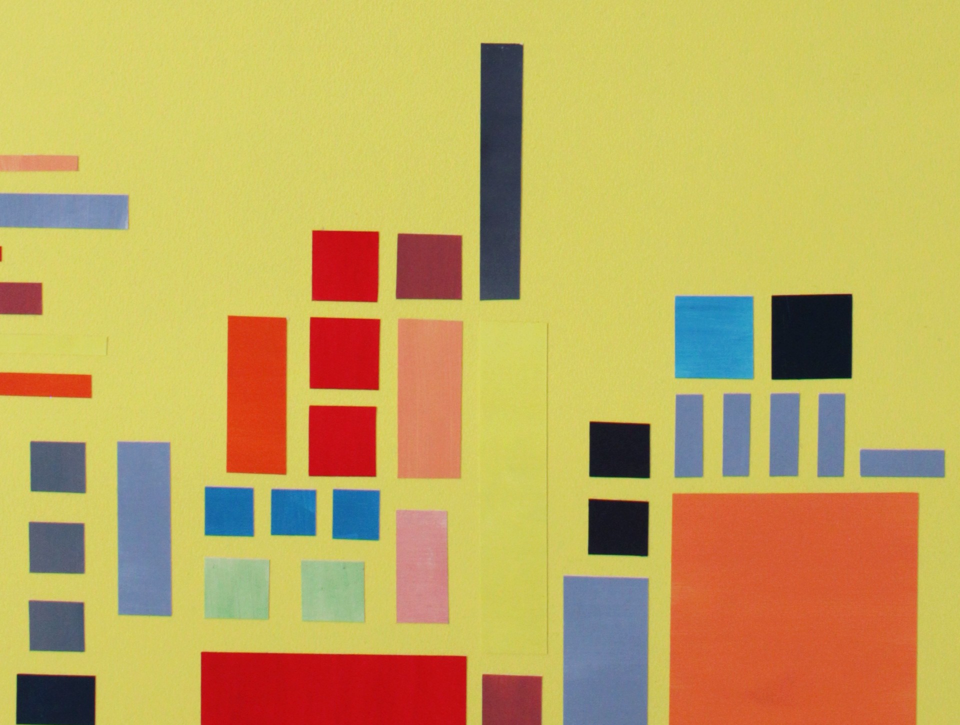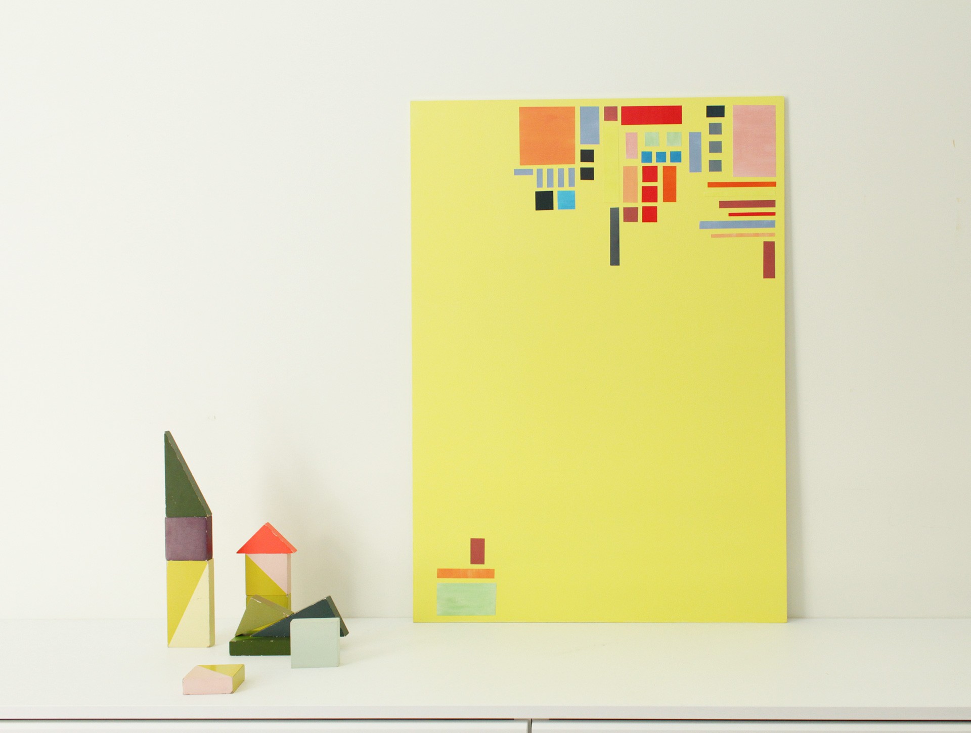 Een serie van 6 schilderijen, geïnspireerd op mijn 6 jarige zoontje Klaas. Klaas is altijd bezig met bouwen en als er een bouwwerk klaar is moet er een foto van gemaakt worden, om het vervolgens af te kunnen breken. Voor mij de inspiratie om te beginnen met een serie “platte” bouwwerken.