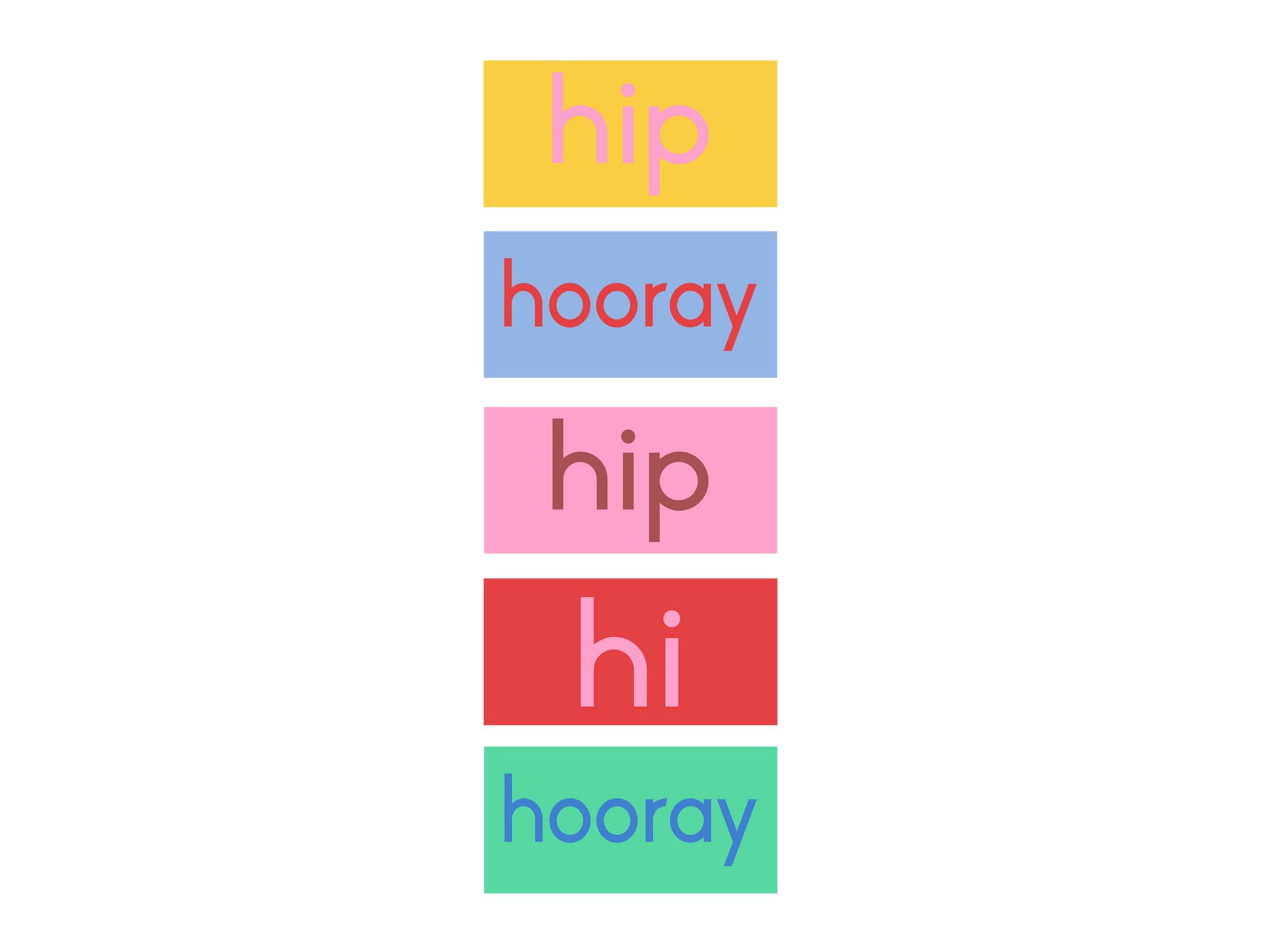 Stickers !!!! — 15 stickers met Hip, of Hi, of Hooray erop. Zo kun je zelf een grappige combi maken op je cadeautje. Hip Hooray! Of Hip Hip, or Hi! etc. Er zijn 5 verschillende stickers.
